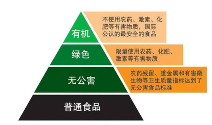 我國對農(nóng)產(chǎn)品的安全分類,包括有機(jī)、綠色、無公害三個等級。分別指對化肥、農(nóng)藥、激素、轉(zhuǎn)基因使用的不同要求。先看一張圖:
