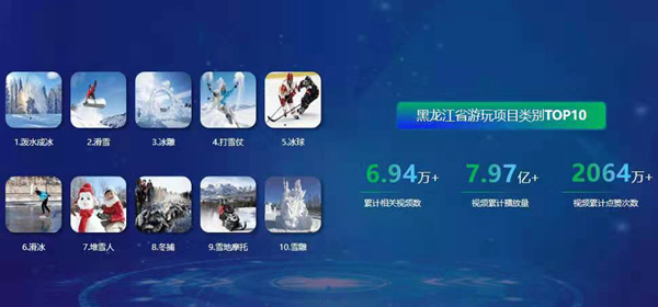 這些游客大部分選擇在冬季來到黑龍江,欣賞冰天雪地。冬季游玩項目是外地游客來黑龍江的源動力,2020年,黑龍江省游玩項目類短視頻TOP10中,潑水成冰類視頻深受用戶的喜愛,排在第一位,其次分別是:滑雪、冰雕、打雪仗、冰球、滑冰、堆雪人、冬捕、雪地摩托、雪雕等,所有游玩項目類視頻累計相關(guān)視頻數(shù)6.94萬+、播放量7.97億+、點(diǎn)贊次數(shù)2064萬+。
