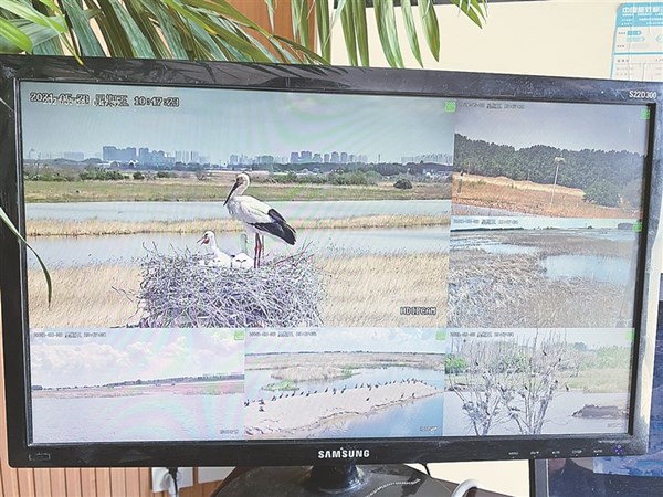 這幾天,黑龍江睿濤環(huán)保科技有限公司辦公室主任王東升總是去鳥類監(jiān)測平臺看來到百鳥湖景區(qū)“安家”的東方白鸛一家。起初,是一對東方白鸛來到這里筑巢。5月中旬,王東升在監(jiān)測平臺的顯示器里驚喜地發(fā)現(xiàn),這對東方白鸛孵化出了5只寶寶。