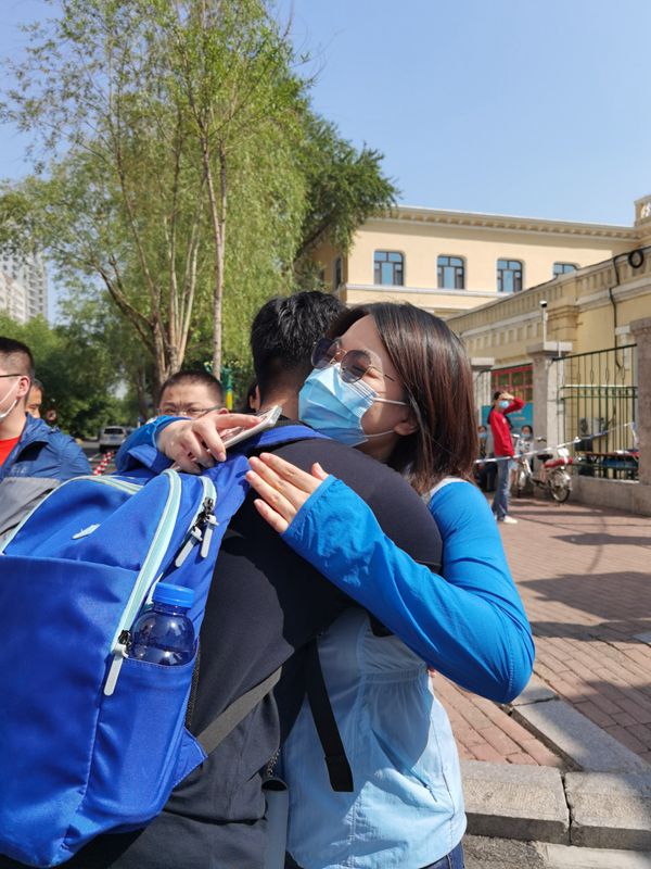站在學(xué)校門前的哈市第一中學(xué)化學(xué)何老師通過擁抱為考生助威。