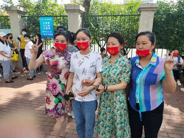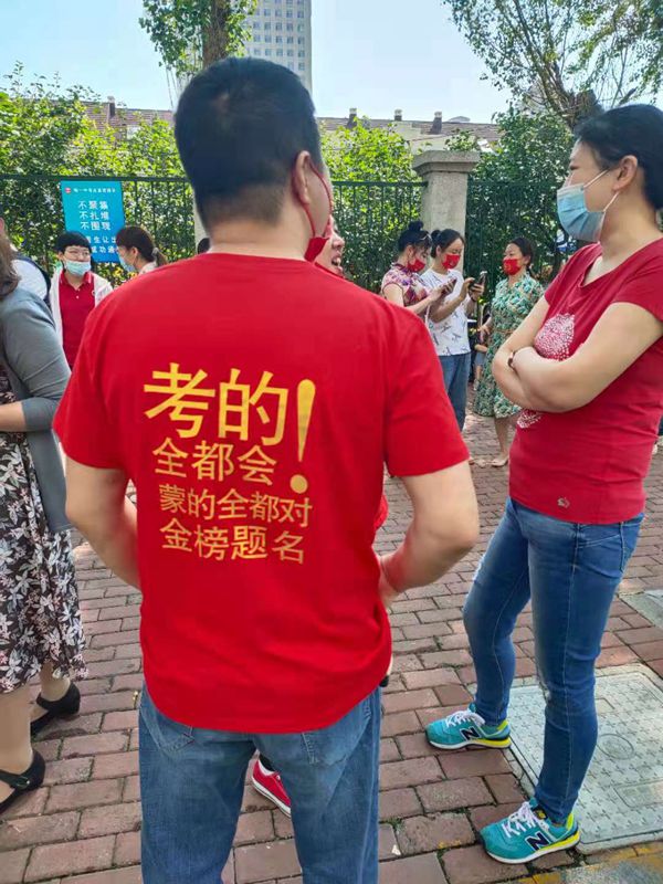助考媽媽,口罩上的文字為金榜題名,圖左家長(zhǎng)身穿旗袍,寓意旗開得勝。