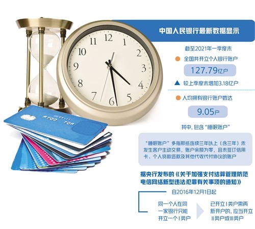 中國人民銀行最新數(shù)據(jù)顯示,截至2021年一季度末,全國共開立個人銀行賬戶127.79億戶,較上季度末增加3.18億戶,人均擁有銀行賬戶數(shù)達(dá)9.05戶。