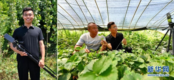 拼版照片:左圖為張成蘊在山西省運城市絳縣臨澮村的田間;右圖為張成蘊(右)在大棚里錄制農(nóng)業(yè)科普視頻(7月14日攝)。今年34歲的張成蘊大學(xué)畢業(yè)后,一直熱衷于用拍攝視頻的方式宣傳家鄉(xiāng)的風(fēng)土人情。2018年8月,他開始在社交平臺上幫助鄉(xiāng)親們直播帶貨,真誠的笑容、優(yōu)質(zhì)的產(chǎn)品和專業(yè)的知識是他吸引粉絲的“訣竅”。