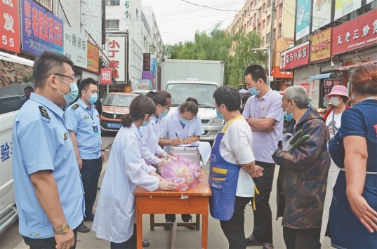 工作人員對(duì)市場(chǎng)蔬菜進(jìn)行抽檢。邸巖攝