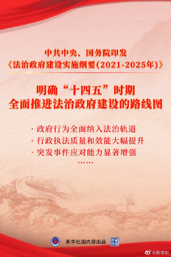 中共中央、國(guó)務(wù)院近日印發(fā)的《法治政府建設(shè)實(shí)施綱要(2021——2025年)》確立了今后五年法治政府建設(shè)的總體目標(biāo),明確到2025年,政府行為要全面納入法治軌道。綱要還提出,著力實(shí)現(xiàn)行政執(zhí)法水平普遍提升,努力讓人民群眾在每一個(gè)執(zhí)法行為中都能看到風(fēng)清氣正、從每一項(xiàng)執(zhí)法決定中都能感受到公平正義。(新華社記者白陽(yáng) 海報(bào)設(shè)計(jì)楊軼群)