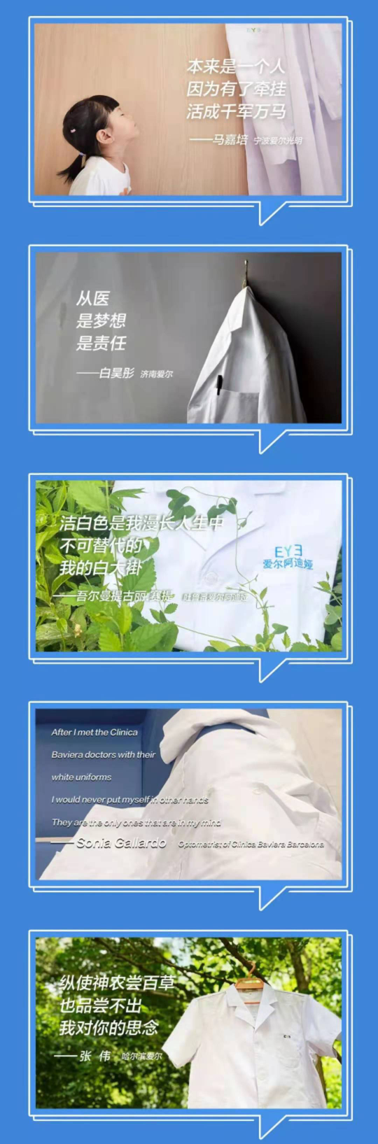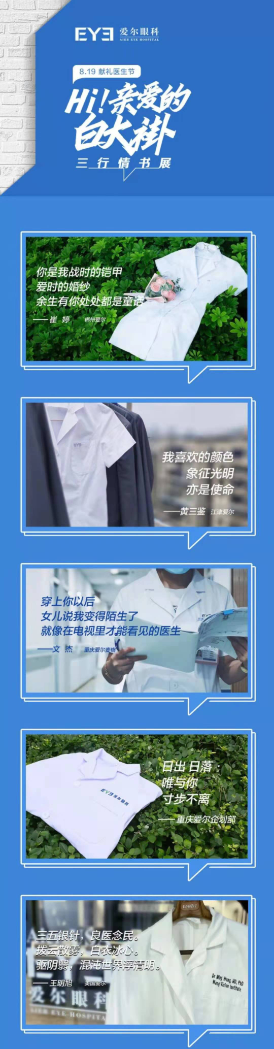 除了溫情脈脈、感動(dòng)滿(mǎn)滿(mǎn)的系列微電影,愛(ài)爾眼科還啟動(dòng)了醫(yī)師節(jié)“三行情書(shū)”征集活動(dòng)。溫柔細(xì)致、多才多藝的醫(yī)生們,用他們或細(xì)膩、或豪放的筆觸,寫(xiě)下了自己對(duì)“白大褂”真摯的情感?;顒?dòng)開(kāi)展以來(lái),共收到海內(nèi)外情書(shū)作品近2000件,最終此次活動(dòng)共評(píng)選出“最美情書(shū)”、“最佳告白”共100個(gè)優(yōu)秀作品。(愛(ài)爾眼科)