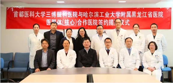 黑龍江省醫(yī)院黨委書記劉宏石、副院長陳鵬,首都醫(yī)科大學(xué)三博腦科醫(yī)院院長徐向英、黨委書記王保國、副院長張宏偉等領(lǐng)導(dǎo)出席,并為牌匾揭牌。黑龍江省醫(yī)院神經(jīng)外二科程化坤主任、護(hù)理部冷菲菲主任及三博腦科醫(yī)院相關(guān)科室負(fù)責(zé)人等參加了本次簽約揭牌儀式。