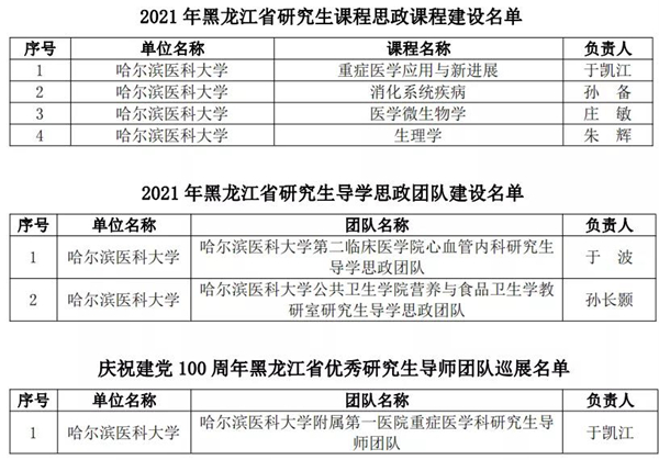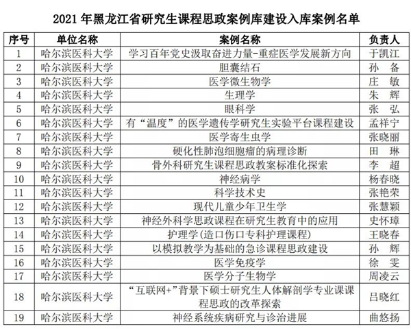 黑龍江經(jīng)濟(jì)網(wǎng)訊(黑龍江日?qǐng)?bào)全媒體見(jiàn)習(xí)記者董廣碩 商祺)為貫徹落實(shí)國(guó)家《關(guān)于全面落實(shí)研究生導(dǎo)師立德樹(shù)人職責(zé)的意見(jiàn)》《高等學(xué)校課程思政建設(shè)指導(dǎo)綱要》《關(guān)于加快新時(shí)代研究生教育改革發(fā)展的意見(jiàn)》精神,按照《關(guān)于加快新時(shí)代黑龍江省研究生教育改革發(fā)展的實(shí)施意見(jiàn)》要求,日前,經(jīng)全省研究生培養(yǎng)單位遴選推薦,黑龍江省研究生課程思政教育聯(lián)盟專家委員會(huì)評(píng)審,省學(xué)位委員會(huì)、省教育廳批準(zhǔn),哈爾濱醫(yī)科大學(xué)共有26個(gè)項(xiàng)目獲批省級(jí)立項(xiàng),其中研究生課程思政課程建設(shè)項(xiàng)目4個(gè)、研究生導(dǎo)學(xué)思政團(tuán)隊(duì)(導(dǎo)師)建設(shè)項(xiàng)目2個(gè)、研究生課程思政案例19個(gè),慶祝建黨100周年巡展優(yōu)秀研究生導(dǎo)師團(tuán)隊(duì)1支。
