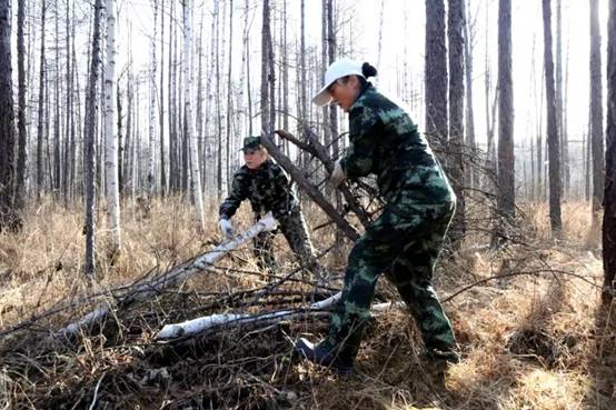 在撫育作業(yè)現(xiàn)地,寒冷的風(fēng)吹拂著干部職工的面龐,腳下過膝高的雜草直往鞋里鉆,一不小心就會踩進冰冷的積水中。雖然工作環(huán)境較為艱苦,可沒有一個人掉隊退出,大家沒有牢騷,沒有埋怨,認真撿拾著被壓木、腐朽木、枯死木、站桿、藤條及老舊伐根等影響中幼林生長的木材。雖然機關(guān)干部職工大多數(shù)人以前都沒有從事過森林撫育工作,但經(jīng)過前期培訓(xùn)和現(xiàn)地實踐,大家對撫育技術(shù)操作要領(lǐng)很快掌握嫻熟,一字排開有序地清林歸堆,彼此間默契呼應(yīng),不一會現(xiàn)地就出現(xiàn)了橫山碼放整齊的枝丫堆。