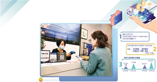 線下場景日益多元的同時(shí),數(shù)字人民幣交易場景也正在發(fā)力線上,形成了“線上+線下”并行推廣的格局?,F(xiàn)在,數(shù)字人民幣已經(jīng)可以在京東、美團(tuán)、滴滴等多個線上場景使用。截至10月22日,已有155萬商戶支持?jǐn)?shù)字人民幣錢包,涵蓋公共事業(yè)、餐飲服務(wù)、交通出行、購物和政務(wù)等各個方面。