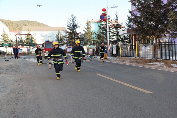 阿木爾公安城鎮(zhèn)消防大隊?wèi)?zhàn)斗員演練雙干線三支水槍
