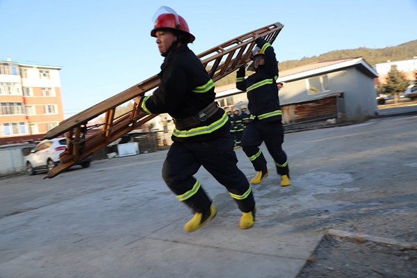 阿木爾公安城鎮(zhèn)消防大隊?wèi)?zhàn)斗員演練二節(jié)拉梯科目(王力/攝)
