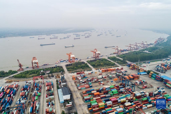 這是10月19日拍攝的武漢陽(yáng)邏港一期碼頭(無人機(jī)照片)。新華社發(fā)(伍志尊攝)