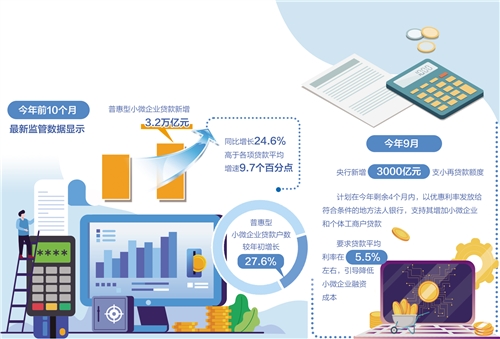 最新監(jiān)管數(shù)據(jù)顯示,今年前10個(gè)月,普惠型小微企業(yè)貸款新增3.2萬億元,同比增長24.6%,高于各項(xiàng)貸款平均增速9.7個(gè)百分點(diǎn);普惠型小微企業(yè)貸款戶數(shù)較年初增長27.6%。
