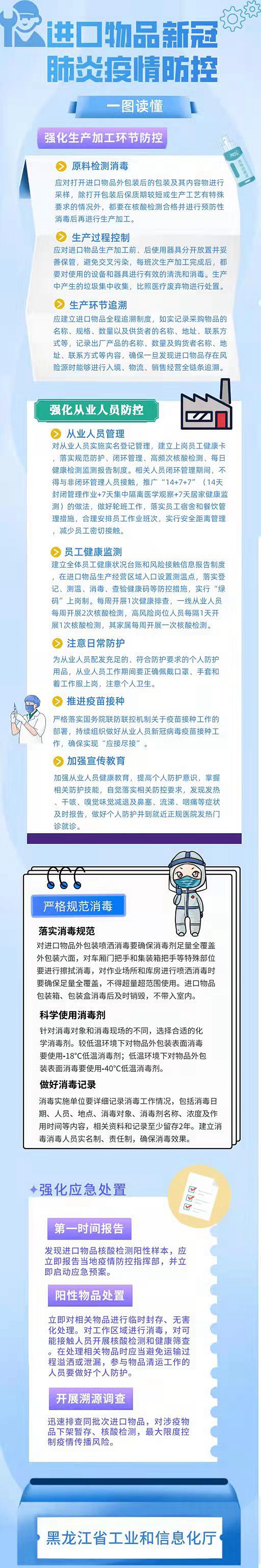 公開信表示,近期疫情反彈形勢嚴峻復雜,為確保工業(yè)企業(yè)不發(fā)生聚集性疫情,共同構筑疫情防控堅固防線,提示:涉及進口物品加工、使用的工業(yè)企業(yè)要嚴格按照《黑龍江省進口物品新冠肺炎疫情風險防控工作方案》落實各項防疫措施。一要強化生產(chǎn)加工環(huán)節(jié)的防控。生產(chǎn)前做好原料檢測消毒,生產(chǎn)中做好過程控制,設備和器具進行有效的清洗和消毒避免交叉污染,產(chǎn)生的垃圾集中收集,比照醫(yī)療廢棄物進行處置。建立進口物品全程追溯制度,確保一旦發(fā)現(xiàn)進口物品存在風險源時能夠進行入境、物流、銷售經(jīng)營全鏈條追溯。二要強化從業(yè)人員防控。對員工實施實名登記管理,做好員工健康監(jiān)測和核酸檢測,合理安排作業(yè)班次,減少密切接觸。配發(fā)充足并符合防護要求的個人防護用品,加強員工健康教育,提高個人防護意識。嚴格落實當?shù)仃P于疫苗接種工作的部署,持續(xù)組織做好員工新冠病毒疫苗接種工作,確保實現(xiàn)“應接盡接”。三要嚴格規(guī)范消毒。對進口物品外包裝、加工場所、車廂門把手和集裝箱把手等要嚴格按照規(guī)范消毒,消毒時要確保足量全覆蓋并針對消毒對象和消毒現(xiàn)場的不同選擇合適的化學消毒劑。詳細記錄消毒工作情況,建立消毒人員實名制、責任制,確保消毒效果。四要強化應急處置。發(fā)現(xiàn)進口物品核酸監(jiān)測陽性樣本,應立即報告當?shù)匾咔榉揽刂笓]部,并同步啟動應急預案。對相關物品進行臨時封存、無害化處理,對工作區(qū)域進行消毒,對可能接觸的人員開展核酸檢測和健康篩查。迅速排查同批次進口物品,最大限度控制疫情傳播風險。
