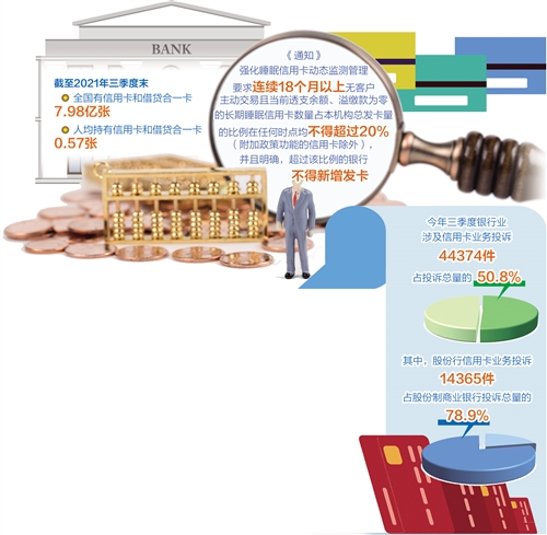 近年來,我國銀行業(yè)金融機構(gòu)信用卡業(yè)務(wù)快速發(fā)展,在便利群眾支付和日常消費等方面發(fā)揮了重要作用。人民銀行發(fā)布的數(shù)據(jù)顯示,截至2021年三季度末,全國有信用卡和借貸合一卡7.98億張,人均持有信用卡和借貸合一卡0.57張。發(fā)卡量激增的同時,行業(yè)亂象也被各界詬病,尤其是消費者針對信用卡過度營銷、亂收費等問題的投訴量近年來居高不下。