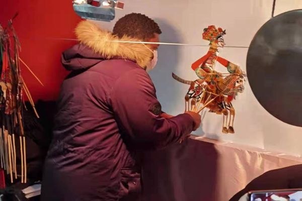 在望奎民間藝人表演的皮影戲現(xiàn)場,留學生們紛紛舉起手機拍照留念,并發(fā)出了陣陣贊嘆?!捌び笆怯皿H皮制作上色的,大家猜猜它是男生還是女生?”對外漢語系教師張明明帶領留學生來到皮影戲的后臺,講解皮影的制作工藝和皮影劇的來歷。留學生們被皮影戲深深吸引,聽得津津有味,并親自操作體驗了一下。