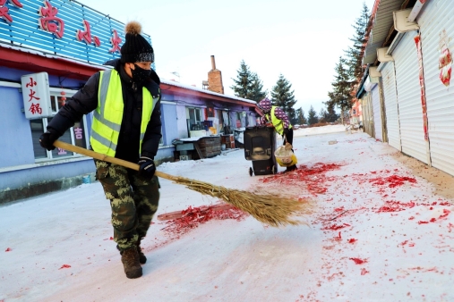 阿木爾林業(yè)局環(huán)衛(wèi)隊環(huán)衛(wèi)工人在大年初一早上清掃責(zé)任區(qū)鞭炮紙屑(王力 攝)
