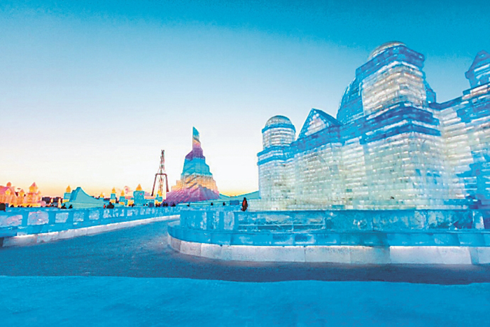 雪是潔白無(wú)瑕的,冰是晶瑩剔透的。在世界最大冰雪主題樂(lè)園——哈爾濱冰雪大世界,冰雪可以是五彩斑斕的。這些取材于松花江面的大冰塊,在白天展現(xiàn)了冰與雪的極致浪漫,宏偉的冰體建筑晶瑩剔透,雪雕作品潔白如玉。待到夜幕降臨,周圍旖旎的燈光亮起,七彩琉璃閃耀著璀璨的光芒,照亮了冰城上空。