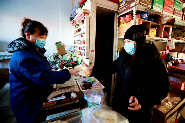 阿木爾林業(yè)局周周蔬菜水果店經(jīng)營(yíng)業(yè)戶周麗霞(左)向客戶銷售“依林河手搟面”(王力 攝)