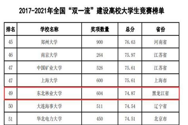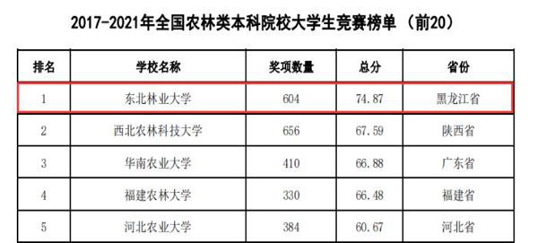 黑龍江經(jīng)濟(jì)網(wǎng)訊(黑龍江日?qǐng)?bào)全媒體見習(xí)記者董廣碩 商祺)近日,中國高等教育學(xué)會(huì)高校競賽評(píng)估與管理體系研究工作組發(fā)布2021全國普通高校大學(xué)生競賽分析報(bào)告,在《2017-2021年農(nóng)林類本科院校大學(xué)生競賽排行榜TOP20》中。東北林業(yè)大學(xué)以總分74.87(獲獎(jiǎng)604項(xiàng))的優(yōu)異成績連續(xù)四年蟬聯(lián)榜首。