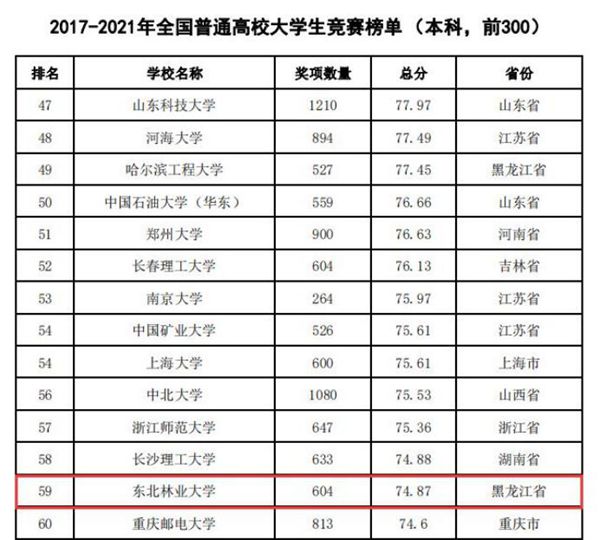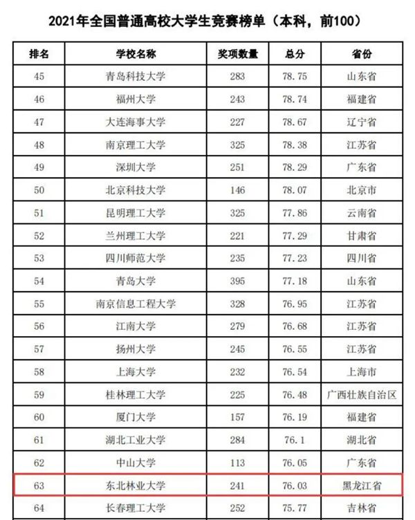 據(jù)悉,中國高等教育學(xué)會(huì)自2017年2月啟動(dòng)《高校競賽評(píng)估與管理體系研究》項(xiàng)目以來,中國高等教育學(xué)會(huì)已經(jīng)連續(xù)發(fā)布六輪榜單,這是我國第一個(gè)專注高校創(chuàng)新人才培養(yǎng)暨學(xué)科競賽成果的排行榜,是檢驗(yàn)高校人才培養(yǎng)質(zhì)量的重要途徑。為從更長的時(shí)間段了解各高校大學(xué)生競賽發(fā)展態(tài)勢(shì),特在今年發(fā)布了“六輪總榜單”,時(shí)間跨度從2012年到2021年,東北林業(yè)大學(xué)以總分73.42,位列全國第63位。
