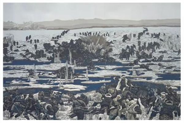 版畫(huà)作品《冰趟子戰(zhàn)役中的趙尚志》實(shí)景再現(xiàn)了東北抗日聯(lián)軍殲敵最多的著名戰(zhàn)役一一冰趟子戰(zhàn)役,展現(xiàn)了趙尚志同志指揮若定、英勇殲敵的英雄形象??孤?lián)戰(zhàn)士借助冰趟子封凍這一東北地區(qū)特有的有利地形,化被動(dòng)為主動(dòng),對(duì)尾追日軍進(jìn)行伏擊,殲滅大量日軍。體現(xiàn)了東北抗聯(lián)在極其惡劣的條件下,捍衛(wèi)中華民族的無(wú)畏斗爭(zhēng)精神。