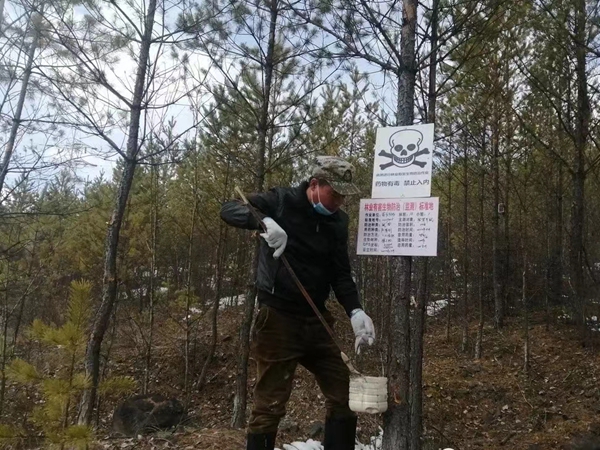采取科學有效的防治方法,根據不同區(qū)域、不同特點投放不孕劑和涂抹防啃劑進行防治。為防止人畜中毒,提前張貼林場鼠害防治公告、在防治區(qū)內樹立警示標牌,避免人員、牲畜進入投放鼠藥區(qū)域。