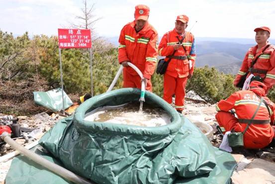 據(jù)了解,此次演練模擬小白山最高峰海拔1404米的“興安第一塔”附近偃松林發(fā)生火情,在海拔886米尋找到一處水源地,撲火隊(duì)員利用高揚(yáng)程山地引水泵向1150米處放置的儲(chǔ)水囊供水,同時(shí)架設(shè)第二臺(tái)水泵向山頂供水,兩臺(tái)水泵交叉接力成功將水引向小白山最高峰,噴淋“興安第一塔”,整個(gè)過程鋪設(shè)水帶全長(zhǎng)3740延長(zhǎng)米,垂直爬高519米。