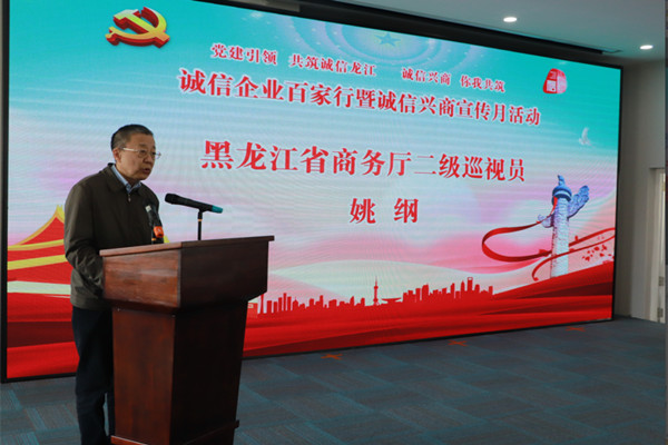 省商務廳二級巡視員姚綱在致辭中指出,此次黑龍江省“誠信企業(yè)百家行”暨“誠信興商宣傳月”活動,是加強誠信宣傳,提升全社會誠實守信意識,優(yōu)化消費和營商環(huán)境的一次重要舉措。省商務廳將會同相關單位統(tǒng)籌協(xié)調、密切配合,做到政府帶頭講誠信,商貿(mào)流通企業(yè)為“誠信興商”活動主體,通過宣傳商務誠信文化和信用管理知識,引導市場主體樹立誠信興商經(jīng)營理念,提高信用管理能力,營造崇信守法的營商環(huán)境。培育消費者信用消費習慣,提升風險防范意識,依法維護自身合法權益,引導和帶動整個商貿(mào)行業(yè)的誠信建設。