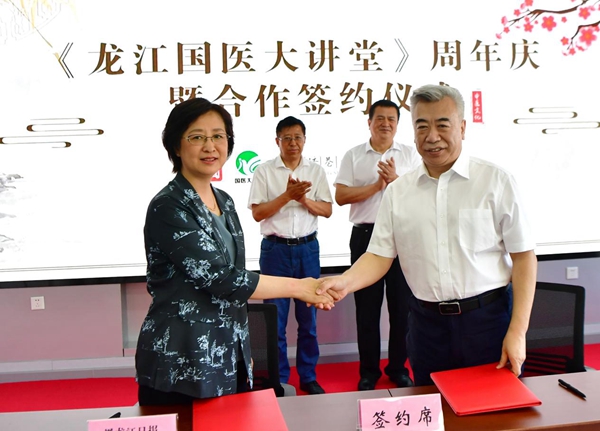 黑龍江日報報業(yè)集團(tuán)黨委書記、社長張春姣與黑龍江省中醫(yī)藥科學(xué)院黨委書記、院長陳宏現(xiàn)場簽約