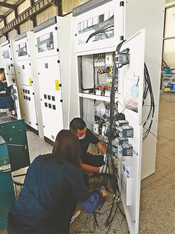 在生產(chǎn)車間,記者看到,工作人員正熟練地組裝配電設(shè)備。該公司擁有現(xiàn)代化廠房2.2萬(wàn)平方米,實(shí)現(xiàn)了工業(yè)化和信息化高度融合。