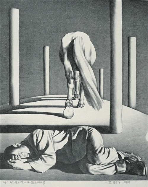 躺著的男人與遠(yuǎn)去的白馬 62×50.5cm 石版畫(huà) 1989年