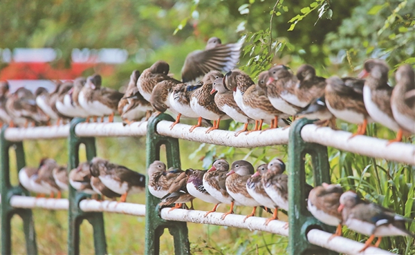 13日,哈爾濱市兆麟公園鴛鴦湖邊,近300只野生鴛鴦在湖邊欄桿上休息,密密麻麻排出近百米的“長(zhǎng)龍”。公園專(zhuān)職看護(hù)鴛鴦的職工車(chē)春虎介紹,目前在公園內(nèi)及周邊出生的小鴛鴦已經(jīng)長(zhǎng)大,加上從周邊濕地飛來(lái)的鴛鴦,每天早晚來(lái)鴛鴦湖覓食的鴛鴦數(shù)量接近300只,這一數(shù)量還在持續(xù)增長(zhǎng)?!邦A(yù)計(jì)國(guó)慶節(jié)前后,數(shù)量能超400只。”