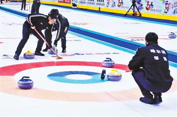 圖為男子冰壺哈爾濱隊比賽現(xiàn)場。(胡錫韋/攝)