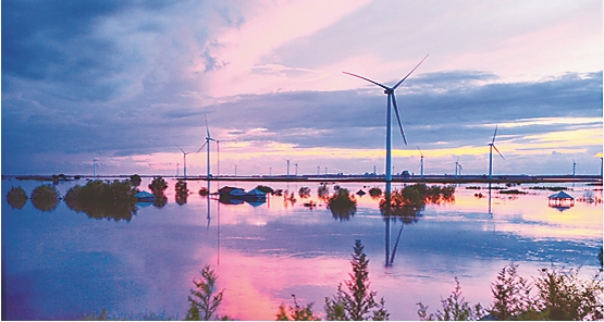 綏濱縣“平原風電之都”高聳旋轉的風車。
