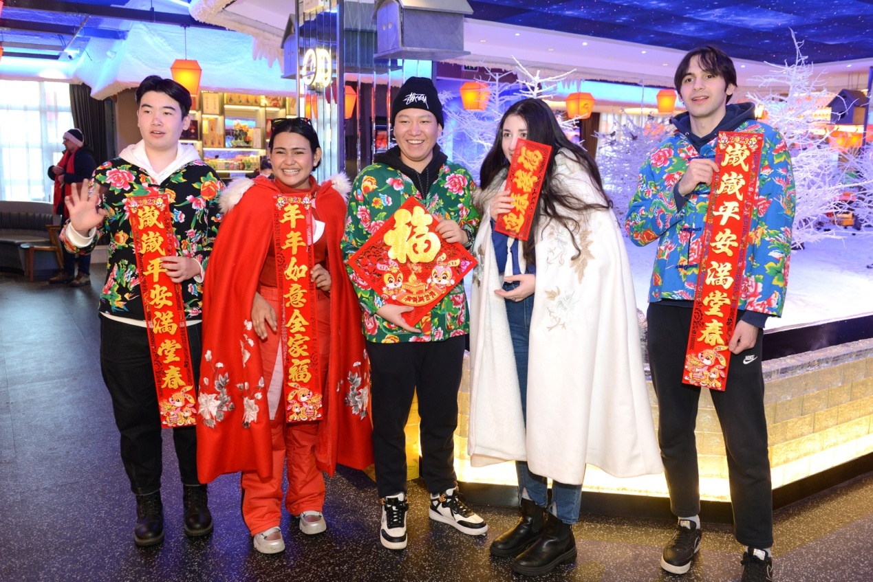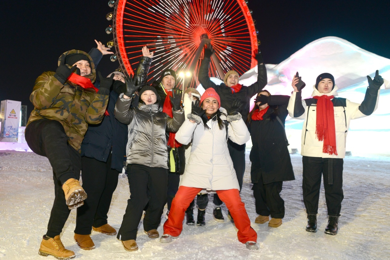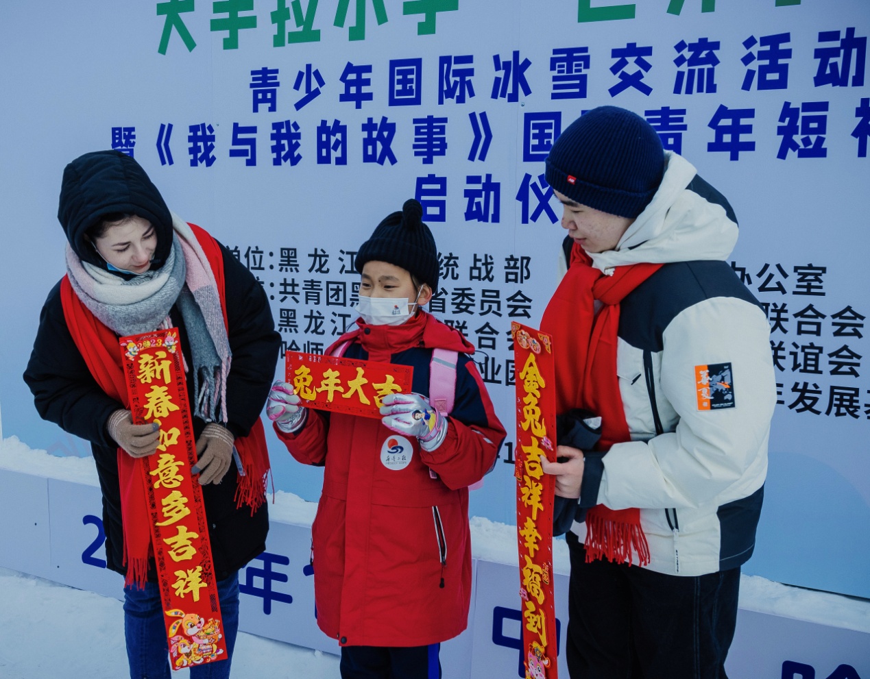 當天上午,在雪博會,來自黑龍江大學的各國留學生代表與中國青少年結對互動,互贈新春禮物,表達對即將迎來的兔年美好祝福。中外青少年小手拉大手,共游太陽島雪博會,鯉魚躍龍門、圓夢啟程、雪冠博覽等雪雕雪景讓大家流連忘返。世界各國青少年一起雕刻“宇航員”雪雕,送上春聯(lián)祝福語,體驗了中國傳統(tǒng)文化和濃濃的年味,表達了對世界文化共融的美好祝愿。