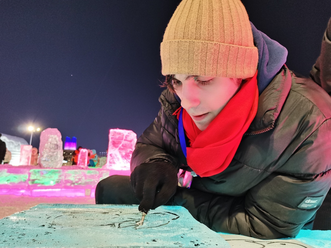 傍晚,中外青少年在流光溢彩、美輪美奐的哈爾濱冰雪大世界中感知冰雪藝術的魅力。在冰雪藝術體驗營聆聽冰雕制作過程,學習將冰與中國傳統(tǒng)木刻版畫相結合,親手設計制作屬于自己獨一無二的冰版畫,體驗冰雪帶來的樂趣。