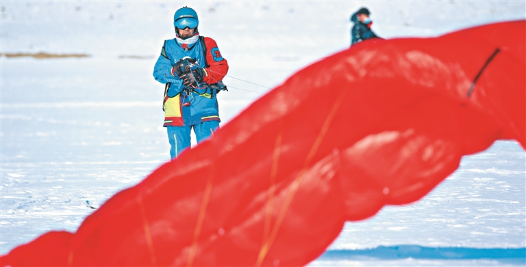 近日,第六屆風(fēng)箏滑雪公開賽在松花江上舉行,幾十位選手在白雪皚皚的江上競(jìng)速馳騁。大風(fēng)箏帶著雪板高速駛過,時(shí)不時(shí)濺起朵朵白雪,宛如在雪上“沖浪”。本次比賽地點(diǎn)位于哈爾濱市呼蘭區(qū)附近江面,此處寬闊平坦,且雪質(zhì)佳,極適宜風(fēng)箏滑雪運(yùn)動(dòng)。
