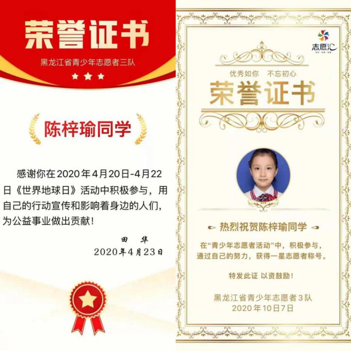 陳梓瑜同學(xué)熱衷于志愿服務(wù)活動。連續(xù)三期參與了為貧困小學(xué)捐書志愿活動、“美化井蓋·建文明城市”系列志愿服務(wù)、積極參與“雛雁計劃助學(xué)活動”,她積極組織策劃了 “小小圖書管理員·你我共建”志愿活動、“垃圾分類小衛(wèi)士”志愿活動、幫助哈爾濱市公安局推廣“防詐騙軟件志愿活動”。