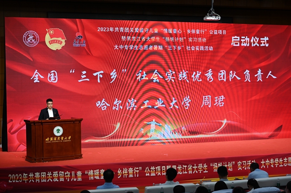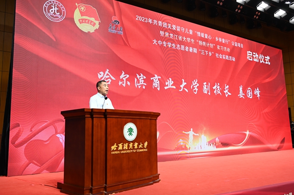 本次活動(dòng),在哈爾濱商業(yè)大學(xué)的大力支持下順利開展,哈爾濱商業(yè)大學(xué)副校長姜國鋒在儀式上致辭,他說:“學(xué)校建校71年來,立足立德樹人根本任務(wù),聚焦‘為黨育人,為國育才’的職責(zé)使命,在不斷加強(qiáng)‘第一課堂’建設(shè)的同時(shí),還依托學(xué)校‘一體兩翼’文化育人模式,充分發(fā)揮實(shí)踐育人的作用,通過開展‘三下鄉(xiāng)’‘返家鄉(xiāng)’等社會(huì)實(shí)踐和‘西部計(jì)劃’‘興邊富民’志愿服務(wù)項(xiàng)目,引導(dǎo)廣大青年學(xué)生堅(jiān)持用習(xí)近平新時(shí)代中國特色社會(huì)主義思想凝心鑄魂,在社會(huì)的課堂中‘受教育、長才干、作貢獻(xiàn)’?!被顒?dòng)現(xiàn)場,播放《黑龍江省希望工程30年與光同行》和黑龍江省大中專學(xué)生志愿者暑期“三下鄉(xiāng)”社會(huì)實(shí)踐活動(dòng)宣傳片,與會(huì)領(lǐng)導(dǎo)上臺(tái)共同啟動(dòng)了“情暖童心·鄉(xiāng)伴童行”公益項(xiàng)目、大學(xué)生“揚(yáng)帆計(jì)劃”實(shí)習(xí)活動(dòng)、大中專學(xué)生志愿者暑期“三下鄉(xiāng)”社會(huì)實(shí)踐活動(dòng)。