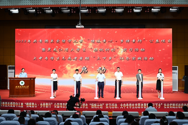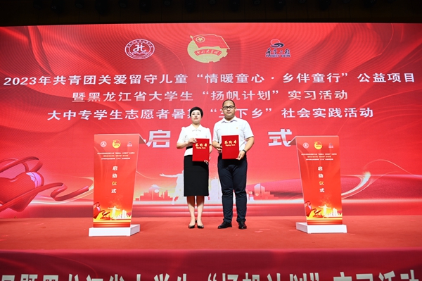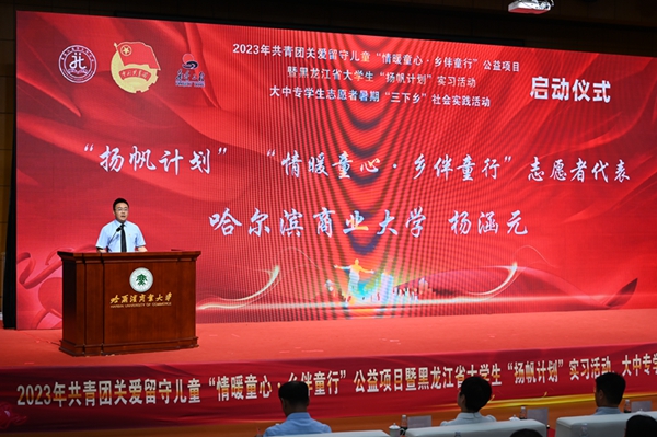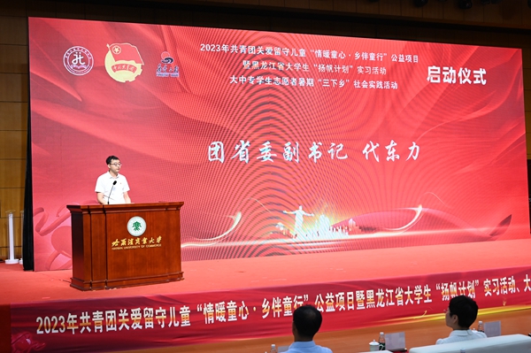黑龍江經(jīng)濟(jì)網(wǎng)訊(王丹陽 記者祝東)7月5日,2023年共青團(tuán)關(guān)愛留守兒童“情暖童心·鄉(xiāng)伴童行”公益項(xiàng)目暨黑龍江省大學(xué)生“揚(yáng)帆計(jì)劃”實(shí)習(xí)活動(dòng)、大中專學(xué)生志愿者暑期“三下鄉(xiāng)”社會(huì)實(shí)踐活動(dòng)啟動(dòng)儀式在哈爾濱商業(yè)大學(xué)隆重舉行。共青團(tuán)黑龍江省委副書記代東力、陳海平,哈爾濱商業(yè)大學(xué)副校長姜國峰,省直機(jī)關(guān)團(tuán)工委書記趙明瑞,黑龍江省人力資源和社會(huì)保障廳、省知識產(chǎn)權(quán)局、省人民檢察院、省青少年發(fā)展基金會(huì)、哈爾濱市南崗區(qū)民政局、哈爾濱海關(guān)、哈爾濱海事局相關(guān)領(lǐng)導(dǎo),以及哈爾濱商業(yè)大學(xué)的志愿者和哈爾濱市樂業(yè)小學(xué)師生代表參加本次活動(dòng)。