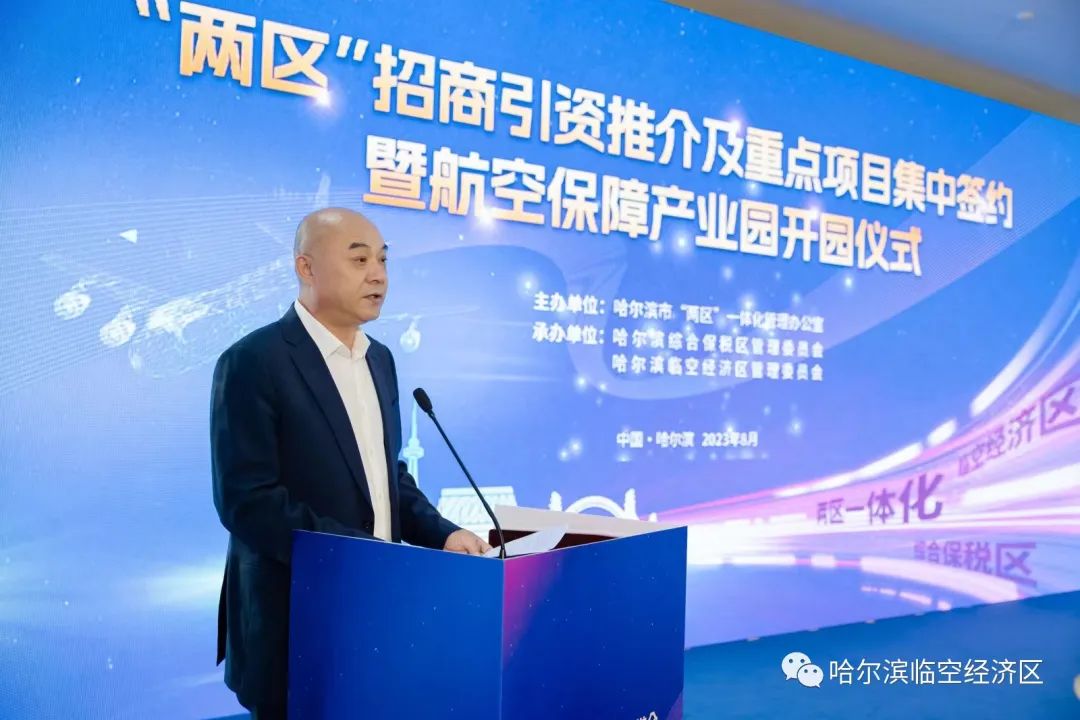 “兩區(qū)”管委會領導分別對哈爾濱綜合保稅區(qū)與哈爾濱臨空經濟區(qū)重點園區(qū)、營商環(huán)境、產業(yè)政策等特色優(yōu)勢作招商推介,誠邀五湖四海的客商朋友來“兩區(qū)”投資興業(yè)、共商發(fā)展,吸引和促進優(yōu)質資源和高端要素匯聚“兩區(qū)”。哈爾濱臨空經濟區(qū)航空保障產業(yè)園在全體來賓的見證下正式啟動,該園總建筑面積12萬平方米,總投資5.6億元,重點發(fā)展航空總部經濟、航空制造產業(yè)、航空物流產業(yè)、臨空制造產業(yè)以及航空服務、航空食品等產業(yè),致力打造為哈爾濱臨空經濟區(qū)發(fā)展現代制造業(yè)的新名片,成為國內知名的航空保障產業(yè)集群。