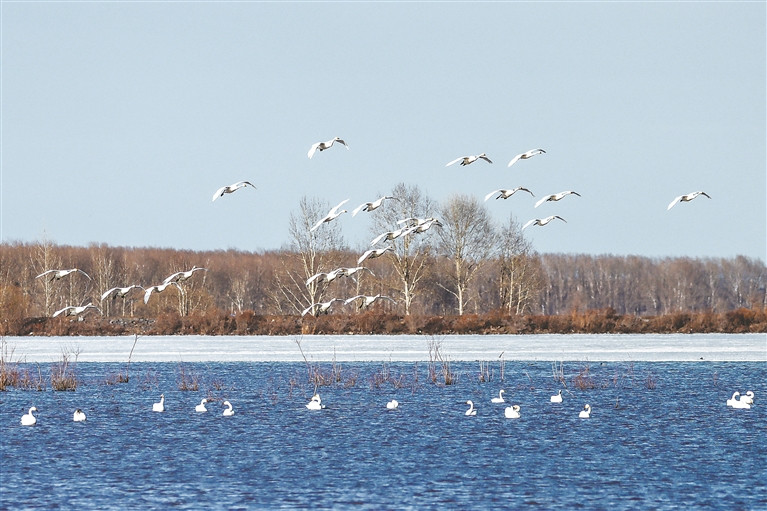 近日,在寶清縣金沙河水庫,百余只白天鵝在水庫里嬉戲追逐。金沙河水庫還沒有完全解凍,呈現(xiàn)出半水半冰的狀態(tài),水面在藍(lán)天映襯下呈現(xiàn)出淡淡的藍(lán)色。白天鵝或愜意地在水中游玩,起舞歡歌,或懶散立于冰面之上,靜若處子,呈現(xiàn)一幅自然和諧的美麗畫卷。