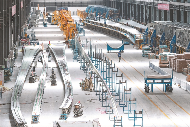 4月28日,在一重龍申(齊齊哈爾)復合材料有限公司,工作人員在廠區(qū)進行風電葉片生產作業(yè)。