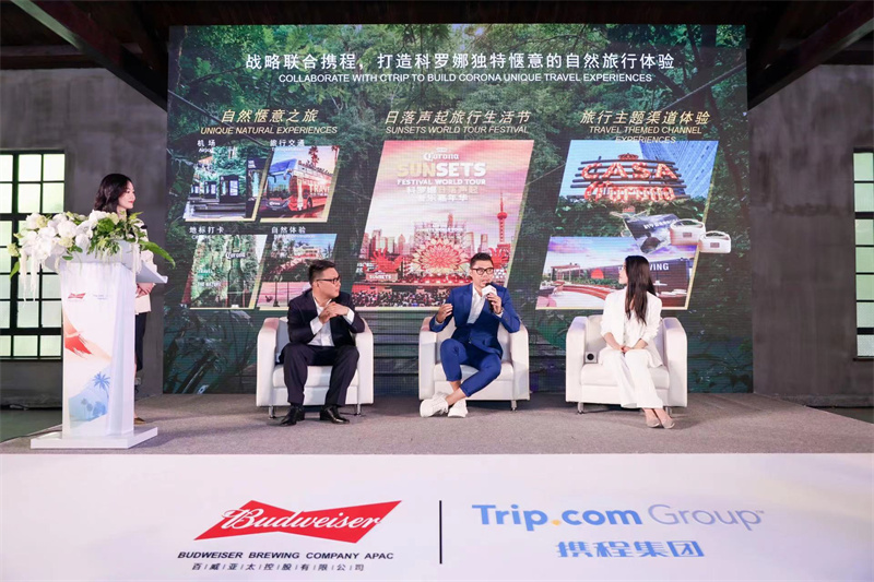 百威亞太首席市場營銷官車祁(中)、攜程集團(tuán)高級(jí)副總裁王韋(左)及旅行博主藺若彤共探“啤酒+旅游”模式下的發(fā)展新機(jī)遇與消費(fèi)新體驗(yàn)