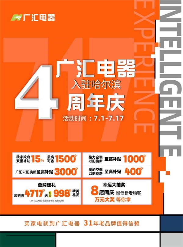 為熱烈慶祝廣匯電器成立31周年,廣匯電器入駐哈爾濱四周年,7月1日起,廣匯電器哈爾濱區(qū)域八店同慶,回饋廣大新老顧客,優(yōu)惠如下: