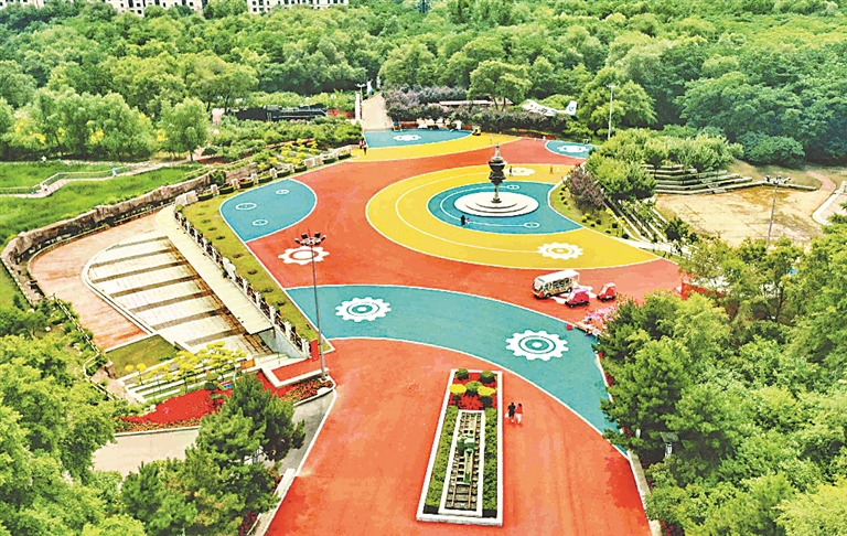 公園內4000多平方米的休閑廣場,經過改造、彩化,呈現出全新的面貌,孩子們在上面騎車、奔跑。彩色廣場將工業(yè)主題元素融入設計理念,與周圍的景觀小品相得益彰。