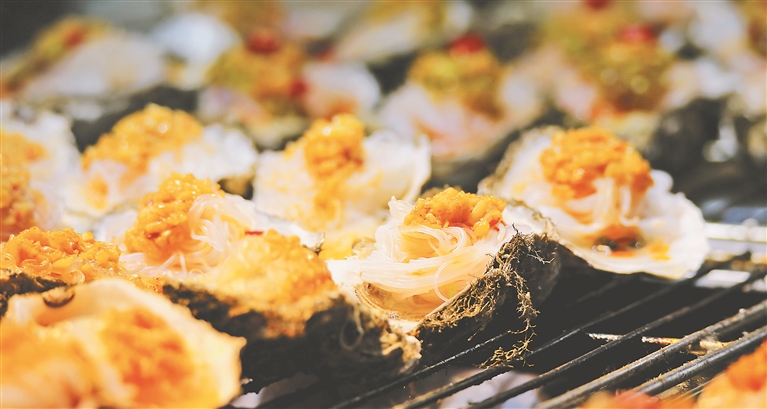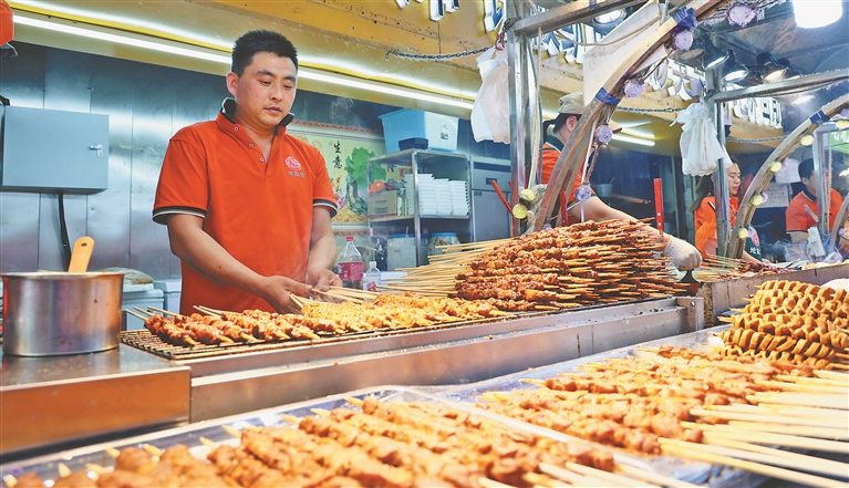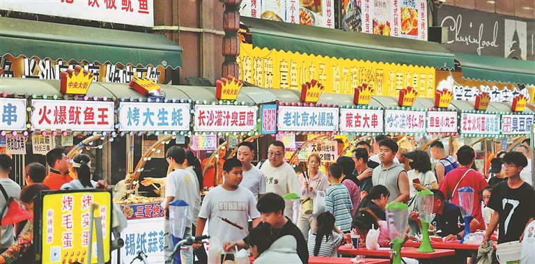 盛夏里,哈爾濱市中央大街的美食夜市燈火通明,人聲鼎沸,各種食物琳瑯滿(mǎn)目,空氣中彌漫著食物的香味。