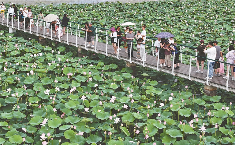 近日,哈爾濱文化中心濕地公園內(nèi)荷花綻放,吐露出它們的花苞,風(fēng)過荷塘帶來陣陣荷香,荷葉上的露水滴落,發(fā)出清脆的聲音,整個荷花池塘展現(xiàn)出夏天獨(dú)有的生機(jī)。這滿塘的荷花爭奇斗艷,吸引眾多游客、市民前來賞花打卡。數(shù)條觀光棧道延伸至濕地深處,人們走在棧道上,近距離觀看野鴨子、白骨頂雞等野生鳥類,與蘆葦、荷花等水生植物親密接觸。